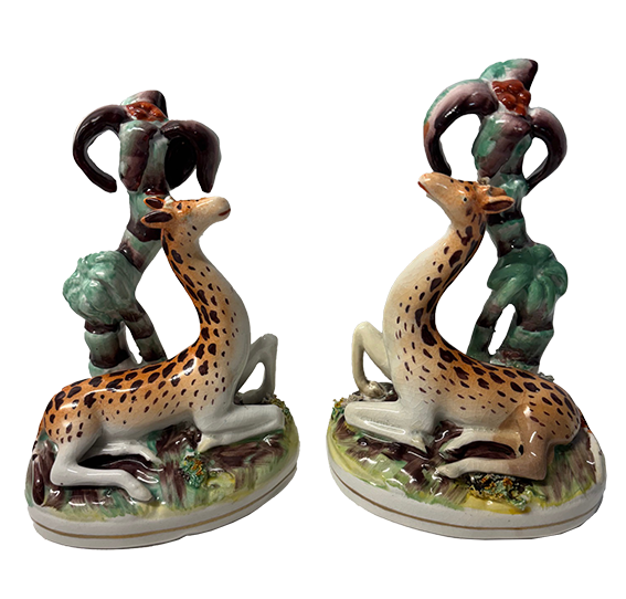 This is a fine pair of Staffordshire giraffes, seated below palm trees, each approximately 5 ½” tall. These figures are very rare, dating to approximately 1850.
