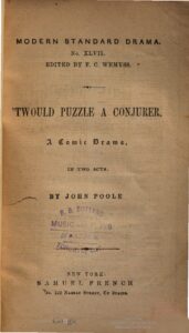 John Poole (1786–1872), an English playwright, was one of the earliest and best known 19th century playwrights of the comic drama, the farce. The 1824 playbill of ‘Twould puzzle a conjurer’ says: