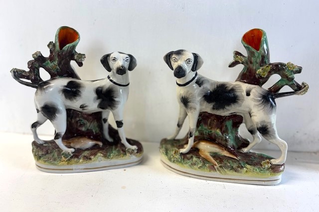 This is a rare pair of Staffordshire foxhounds, pointers, or game dogs. Whatever one decides to call them, they are an unusual and very fine pair.